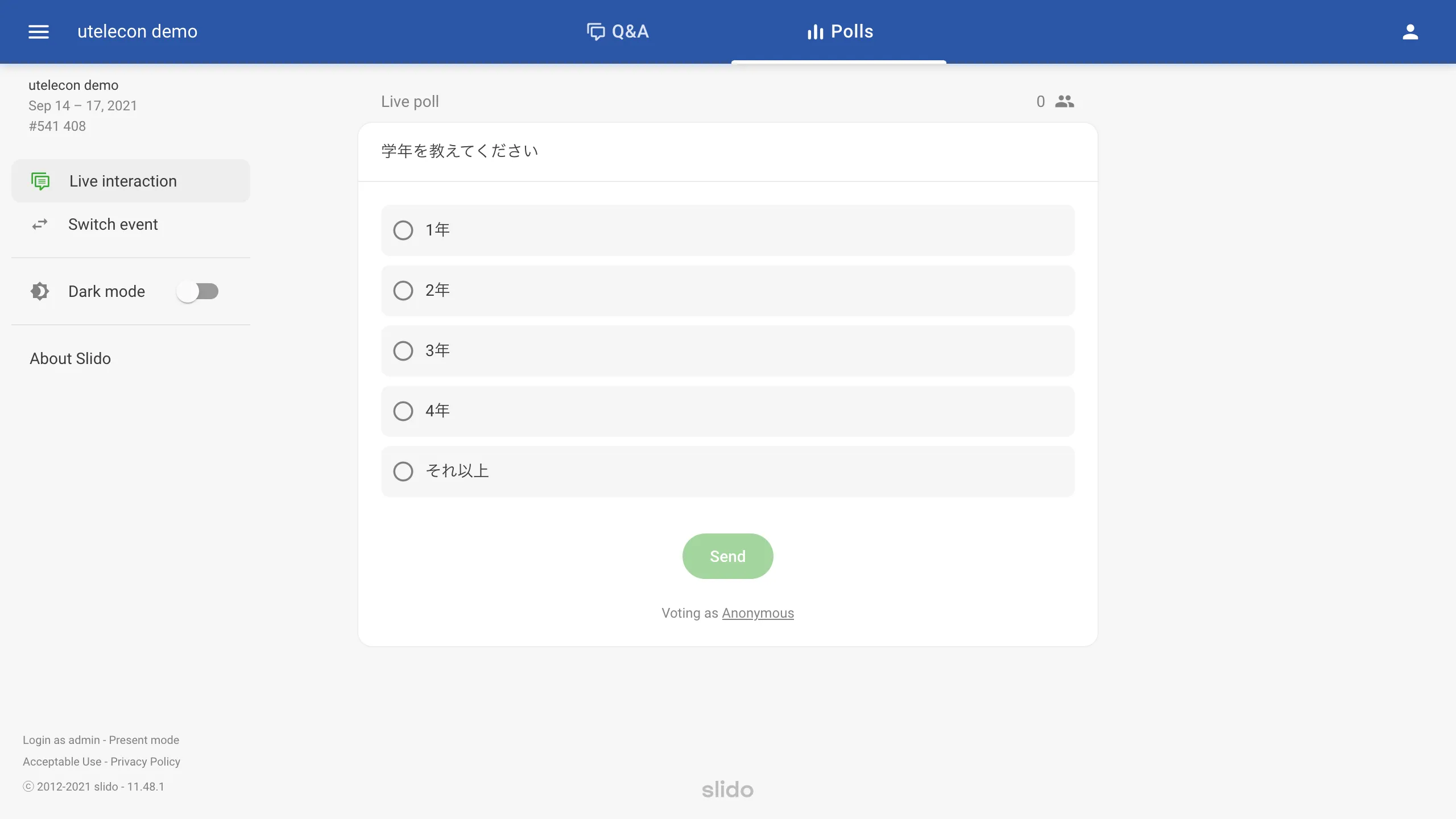 画面上部の「Polls」を選択すると,主催者からの質問やアンケートに答えることができます.