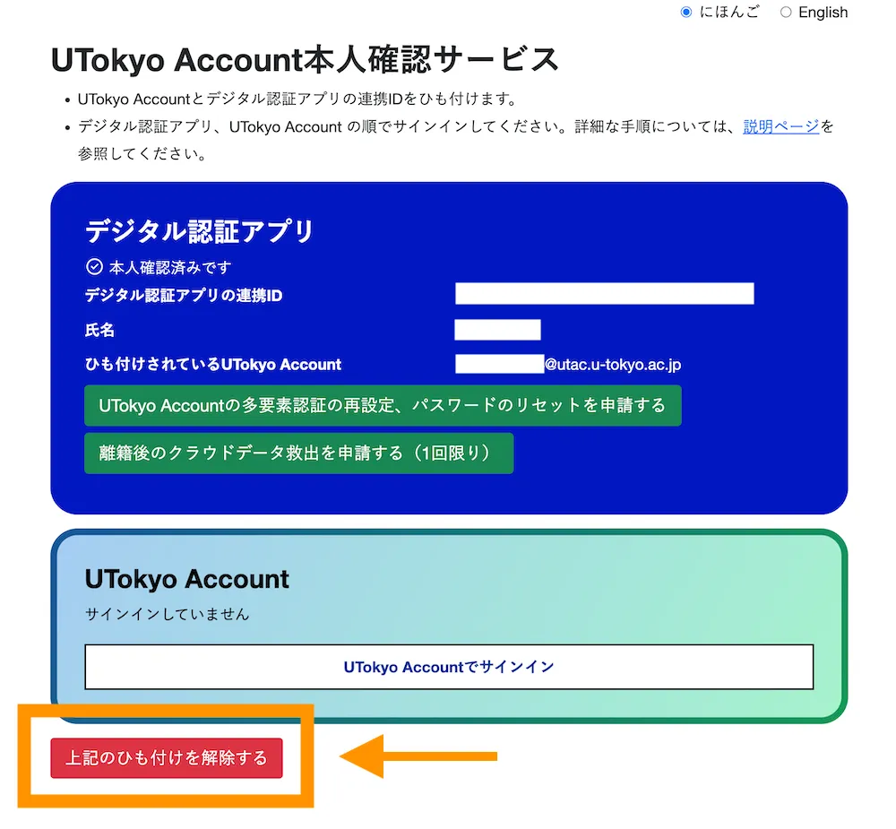 5. 「UTokyo Account本人確認サービスを利用していません」と表示されていれば,連携解除が完了しています.