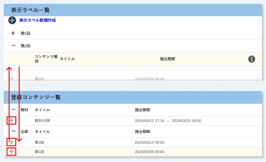 - 新たにラベルを紐づける場合は,「登録コンテンツ一覧」から「表示ラベル一覧」の追加したいラベルへ移動させてください.
