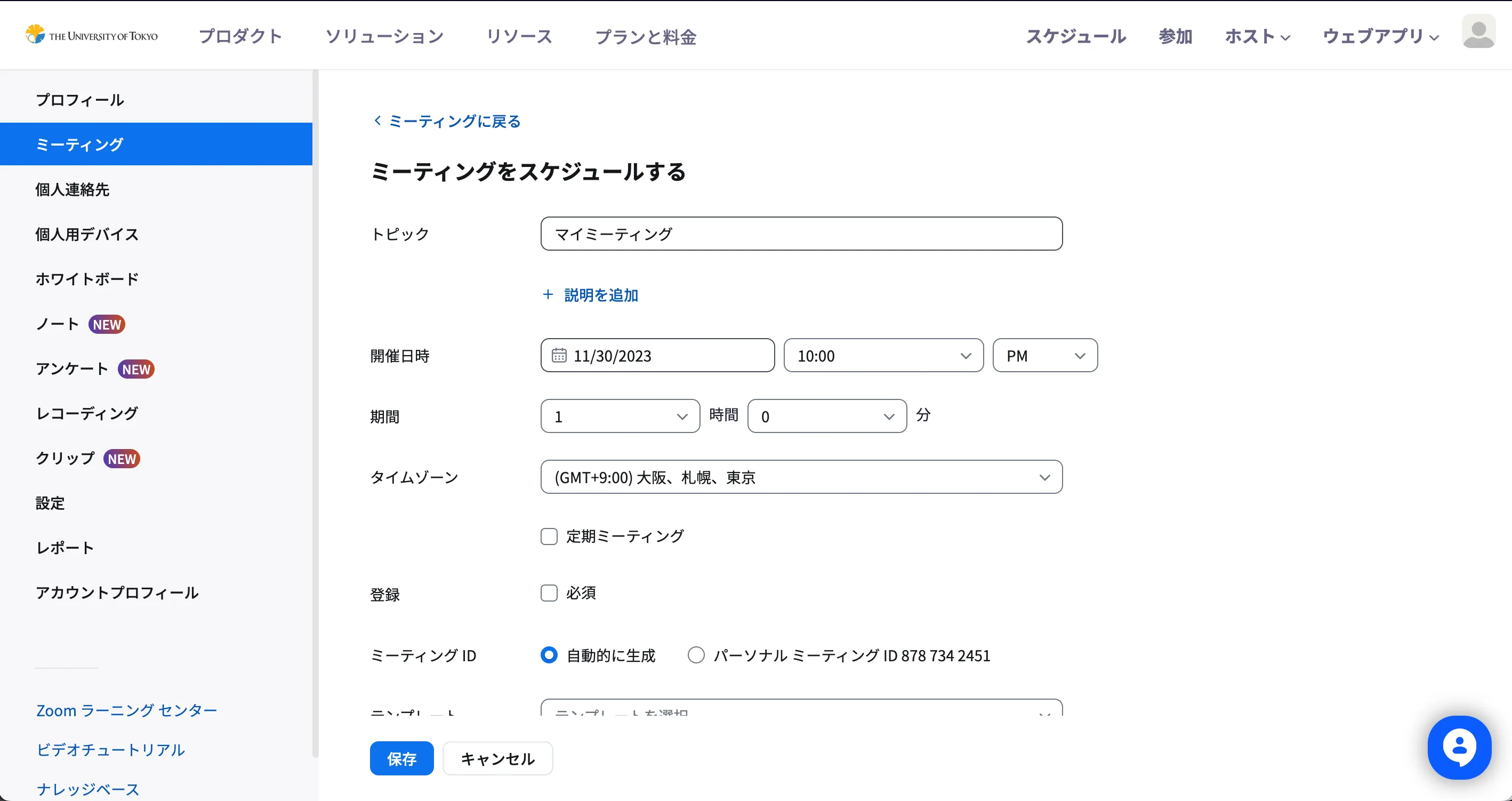 - 「保存」ボタンを選択してください.Zoomミーティングが作成されます.
